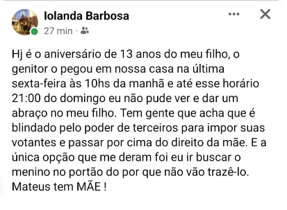 De acordo com Iolanda no último domingo (23) foi aniversário do menor, de 13 anos, que estava com Moacir desde a sexta-feira anterior. De acordo com ela o ex-parlamentar teria dificultado a volta do garoto para casa no dia do seu aniversário e a mulher só teve o direito de ver o filho no final do dia porque foi buscá-lo na porta da casa do pai.